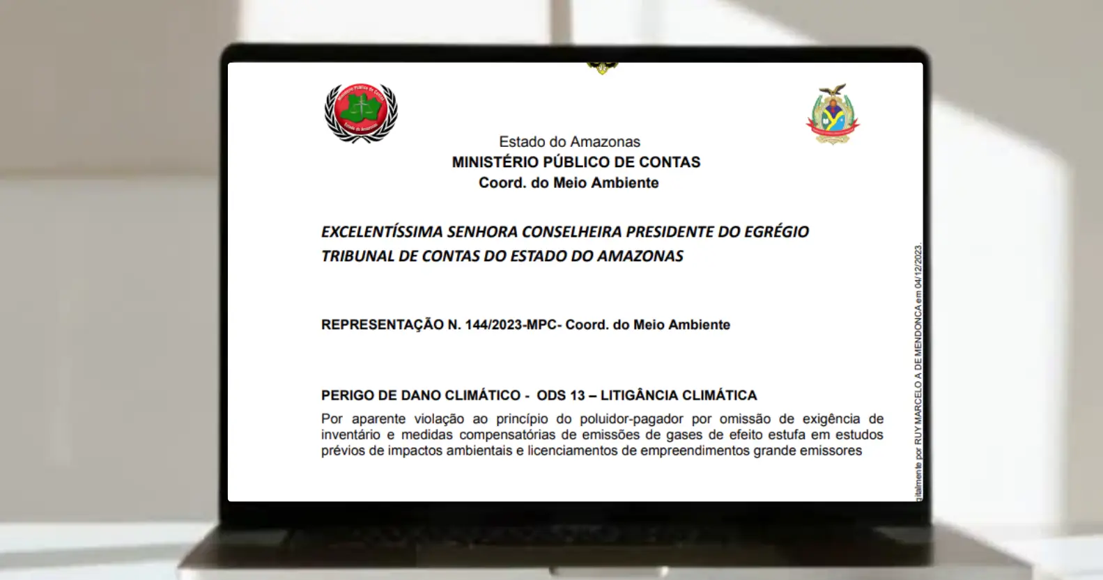 O Ministério Público de Contas do Amazonas (MPC-AM), por meio de sua Coordenadoria do Meio Ambiente, coordenada pelo procurador de contas Ruy Marcelo Alencar de Mendonça, formalizou uma Representação junto ao Tribunal de Contas do Estado do Amazonas (TCE-AM) que resultou na imposição de medidas obrigatórias ao Instituto de Proteção Ambiental do Amazonas (IPAAM) para fiscalizar e controlar grandes emissores de gases de efeito estufa (GEE) no estado.
